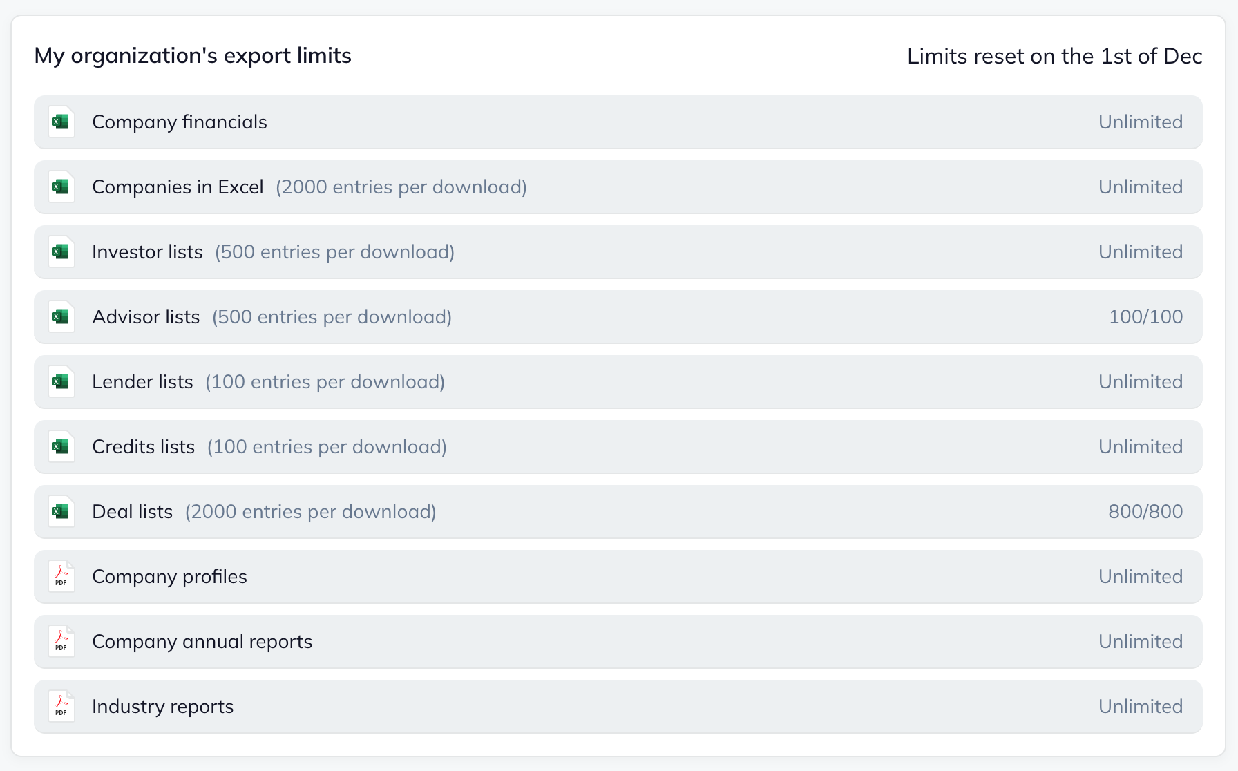 You can export lists of: companies, legal entities, investors, strategies, lenders, credits, advisors and deals. Additionally, you can export PDF versions of company profiles and industry reports. Lastly, financials and annual reports can also be downloaded.