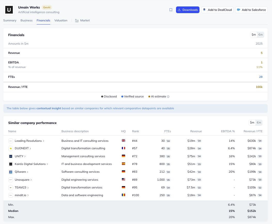 Where no financials are available, our machine learning models estimate Revenue (based on Rev / FTE) and EBITDA (based on est. EBITDA margins) to fill in the gaps.