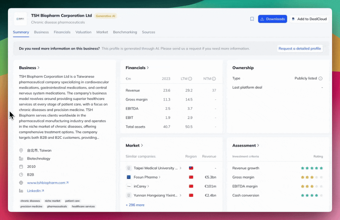 You can request that our analyst team create a detailed Curated Company profile, where the business meets our criteria (50m+ Revenue / 5m+ EBITDA / 250+ FTEs / 10m+ funding).